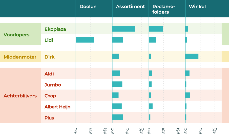 Sinds de vorige meting in 2020 zijn er maar erg weinig verbeteringen. Sommige supermarkten doen het niet beter of slechter dan twee jaar geleden, zoals Dirk. Andere supermarkten blijven achter in het stimuleren van een gezond eetpatroon, waaronder Coop en Albert Heijn. Wat verder opvalt:
