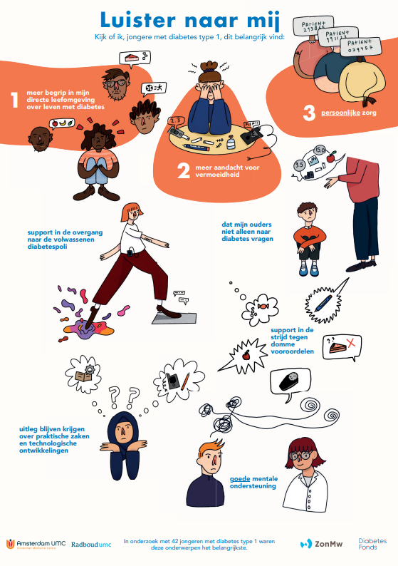 In gesprek met 42 jongeren met diabetes type 1 kwamen acht belangrijke onderwerpen naar voren. Met de poster vragen de jongeren daar aandacht voor. (Klik op de afbeelding om te openen of te downloaden).