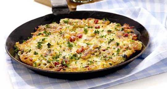 Meng de aardappel, courgette en ui met 30 g gekookte hamblokjes, 1 ei en volkorenmeel.