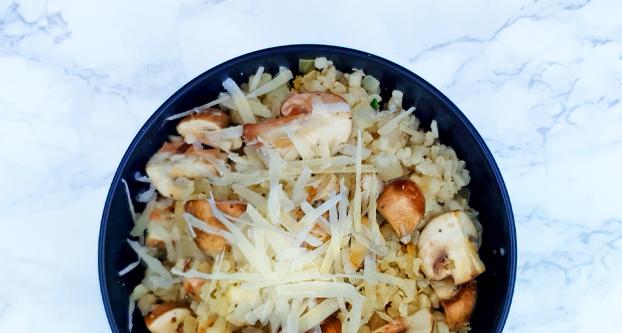 Haal de pan van het vuur en laat het overtollige vocht uitlekken. Voeg dan de mozzarella en Parmezaanse kaas (laat een klein beetje over voor de garnering) toe en roer dit door de bloemkoolrisotto.