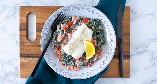 Schep de groenten in diepe borden en leg de kabeljauwfilet erop. Serveer eventueel met een extra partje citroen.